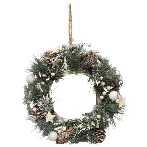 Couronne de noël à suspendre en bois avec boules et pommes de pin - Diamètre 32 cm - Vert, Blanc et Marron