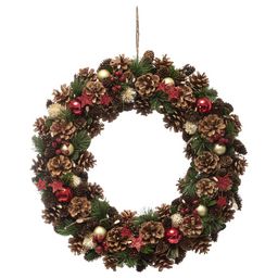 Créez votre ambiance de Noël grâce à cette couronne.FICHE TECHNIQUE- Couronne de Noël.- Modèle à suspendre.- Matière : Bois et polystyrène.- Tendance Nature.- Couleur : Marron, vert et rouge.CARACTERISTIQUES TECHNIQUES- Dimensions : Diamètre 50 cm x Profondeur 8 cm.- Poids : 0,840 kg.