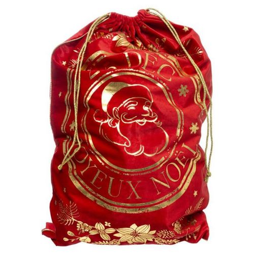 Informations Techniques : Dimensions : L. 50 x l. 0,5 x H. 70 cm Matière : Polyester Spécificités : Pratique & Utile Hotte de Noël Revêtement Velours Motif Père Noël Poids : 0,14 kg Couleur : Rouge & Or