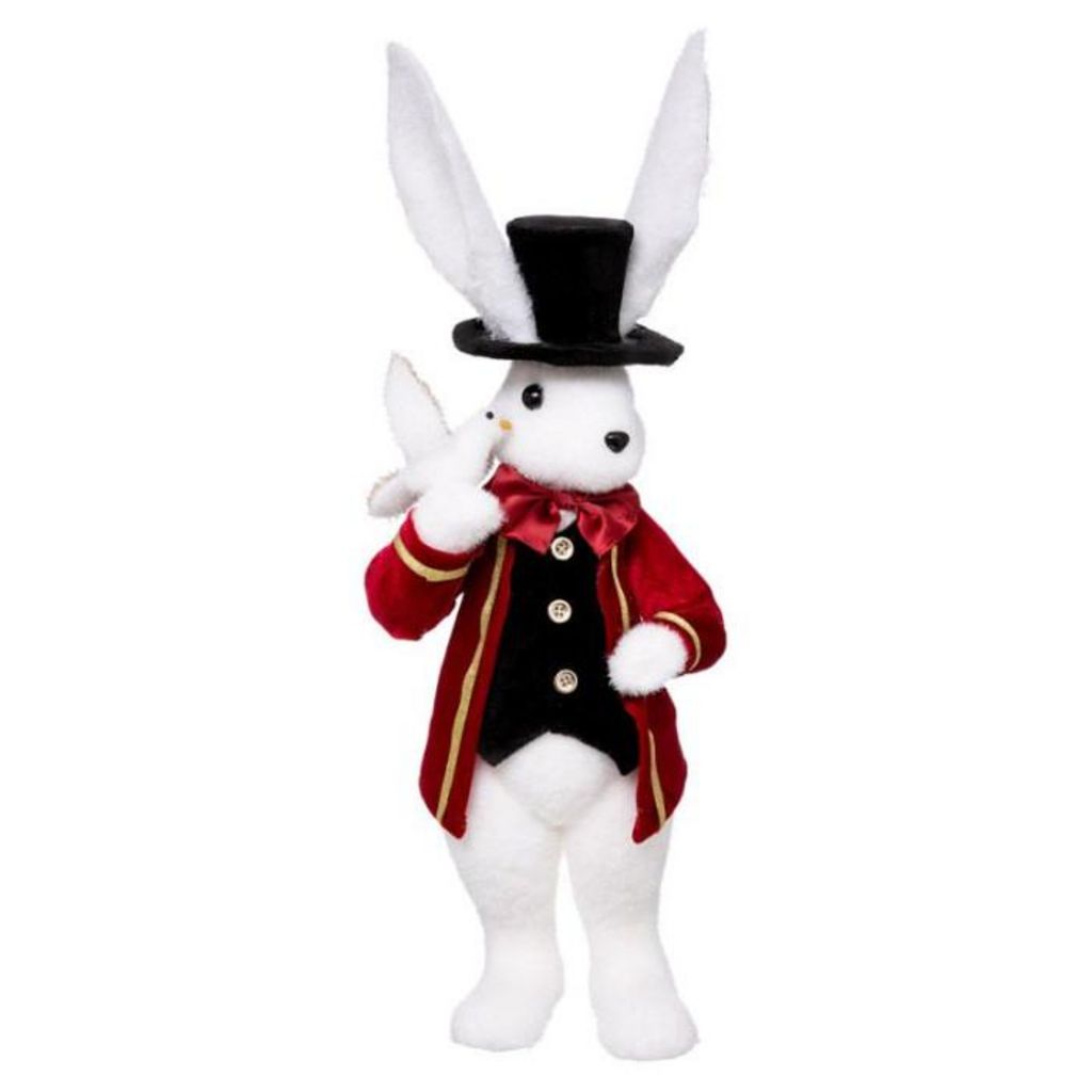 Informations Techniques : Dimensions : L. 18 x l. 18 x H. 53 cm Matières : Polystyrène & Polyester Spécificités : Pratique & Utile Lapin Cirque Avec Veste & Chapeau A Poser Poids : 0,2 kg Couleur : Blanc & Rouge