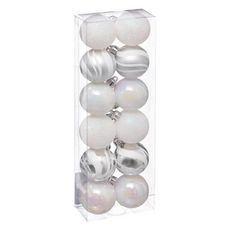 Informations Techniques : Dimensions : D. 4 cm Boîte : L. 8 x l. 4 x H. 24 cm Matières : PVC Spécificités : Pratique & Utile Lot de 12 Boules de Noël Forme Ronde Poids : 0,048 kg Couleur : Argent & Blanc