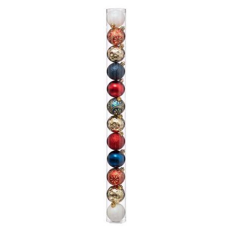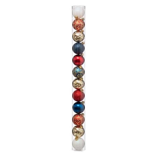 Informations Techniques : Dimensions : D. 6 cm Boîte : D. 6,5 x H. 71 cm Matière : PVC Spécificités : Pratique & Utile Lot de 12 Boules de Noël Forme Ronde Poids : 0,133 kg Couleur : Multicolore