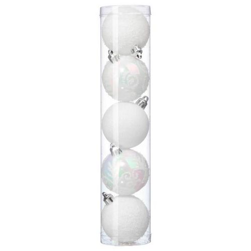 Informations Techniques : Dimensions : D. 5 cm Boîte : D. 5 x H. 25 cm Matières : Plastique Spécificités : Pratique & Utile Lot de 5 Boules de Noël Forme Ronde Design : Paillettes, Brillant & Mat Poids : 0,045 kg Couleur : Blanc