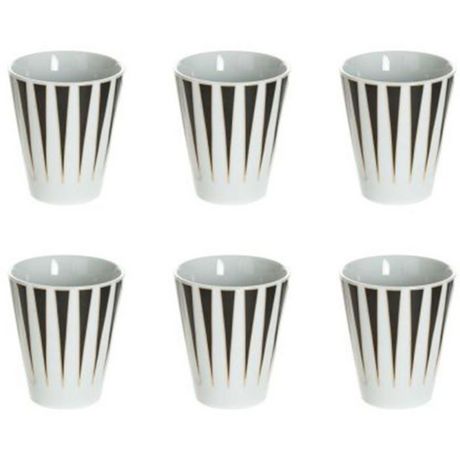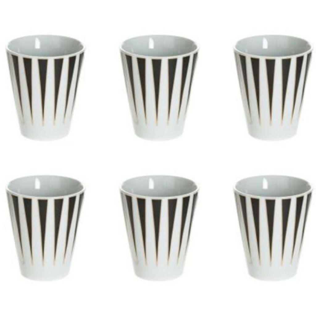 Informations Techniques : Dimensions : D. 6 x H. 7 cm Matière : Porcelaine Spécificités : Contenance : 9 cl Vendu par lot de 6 Tasses Lavage à la main uniquement Ne convient pas à un usage au micro-onde & au four Couleur : Blanc & Noir