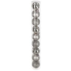 Informations Techniques : Dimensions : D. 6 cm Boîte : D. 6,1 x H. 53 cm Matière : Plastique Spécificités : Pratique & Utile Lot de 9 Boules de Noël Forme Ronde Design : Brillant, Mat & Pailleté Poids : 0,113 kg Couleur : Argent