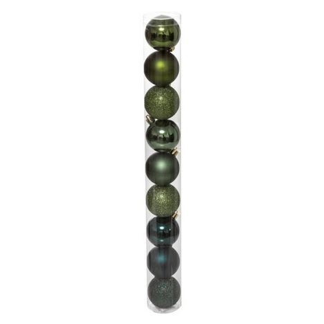 Informations Techniques : Dimensions : D. 6 cm Boîte : D. 6,1 x H. 53 cm Matière : Plastique Spécificités : Pratique & Utile Lot de 9 Boules de Noël Forme Ronde Design : Brillant, Mat & Pailleté Poids : 0,113 kg Couleur : Olive