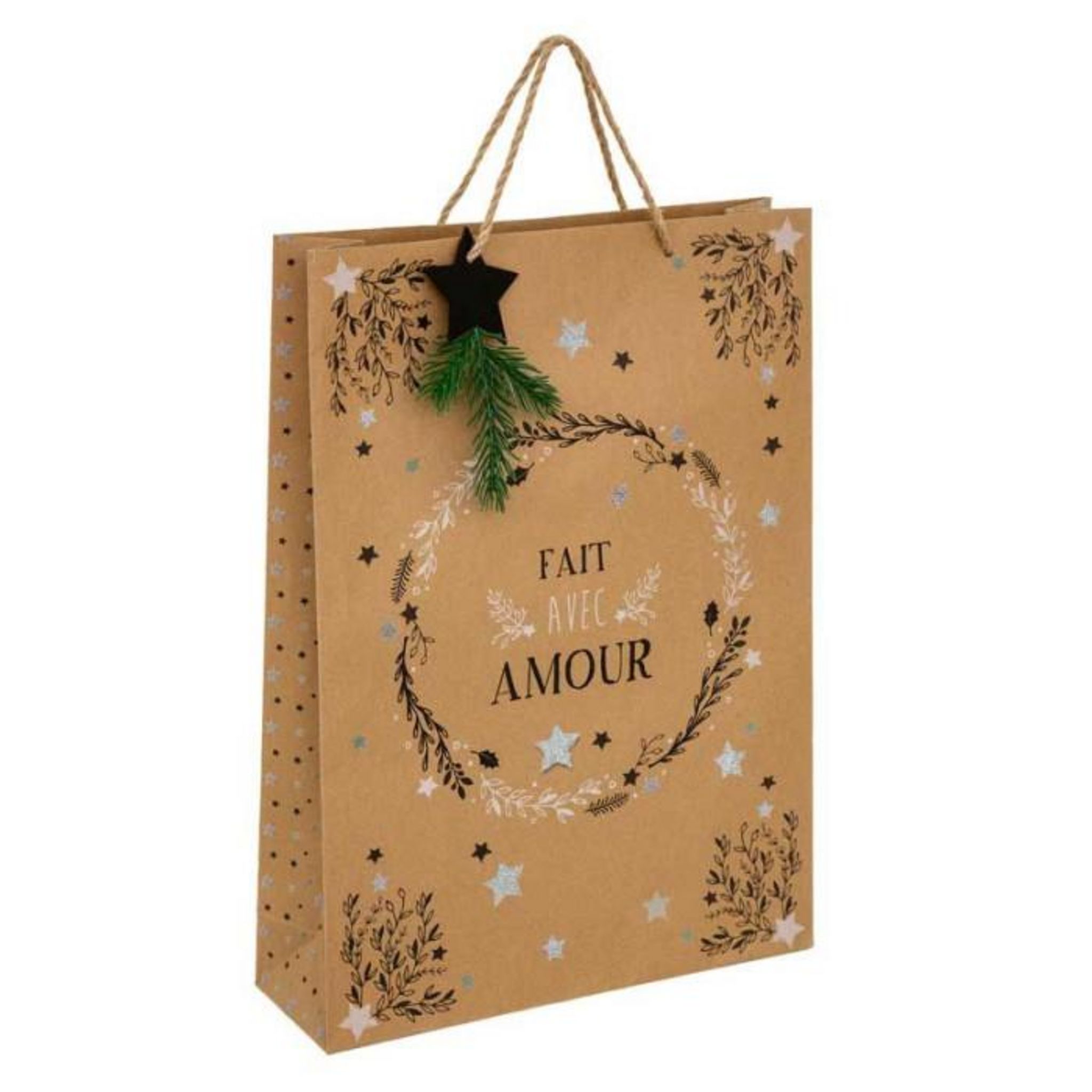 Informations Techniques : Dimensions : L. 33 x l. 10,2 x H. 45,5 cm Matière : Papier Spécificités : Pratique & Utile Sac Cadeau Avec Anses Design Couronne, Branches & Étoiles Inscription Fait avec Amour Poids : 0,096 kg Couleur : Naturel