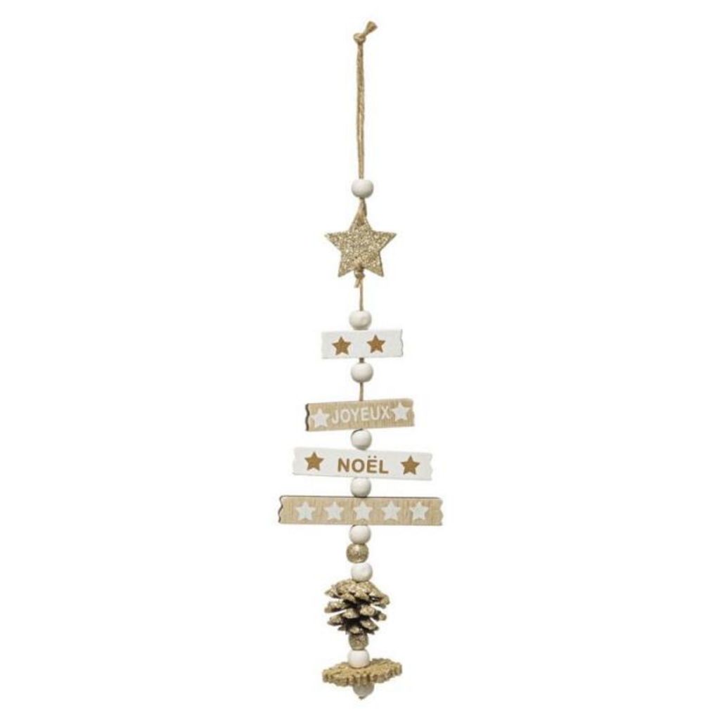 Informations Techniques : Dimensions : L. 8 x l. 0,5 x H. 31 cm Matière : Bois Spécificités : Pratique & Utile Sujet de Noël A Suspendre Design Sapin Articulé Avec Étoile, Pomme de Pin & Flocon Inscription Joyeux Noël Poids : 0,026 kg Couleur : Blanc & Naturel
