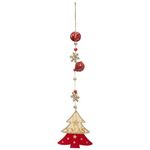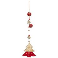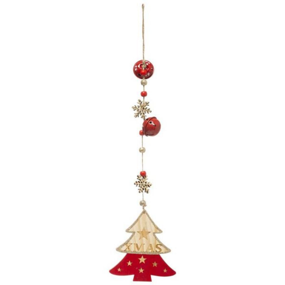 Informations Techniques : Dimensions : L. 12,5 x l. 0,5 x H. 42 cm Matière : Bois Spécificités : Pratique & Utile Sujet de Noël A Suspendre Design Sapin avec 2 Flocons & 2 Clochettes Inscription Xmas Avec Pailettes Poids : 0,03 kg Couleur : Naturel & Rouge