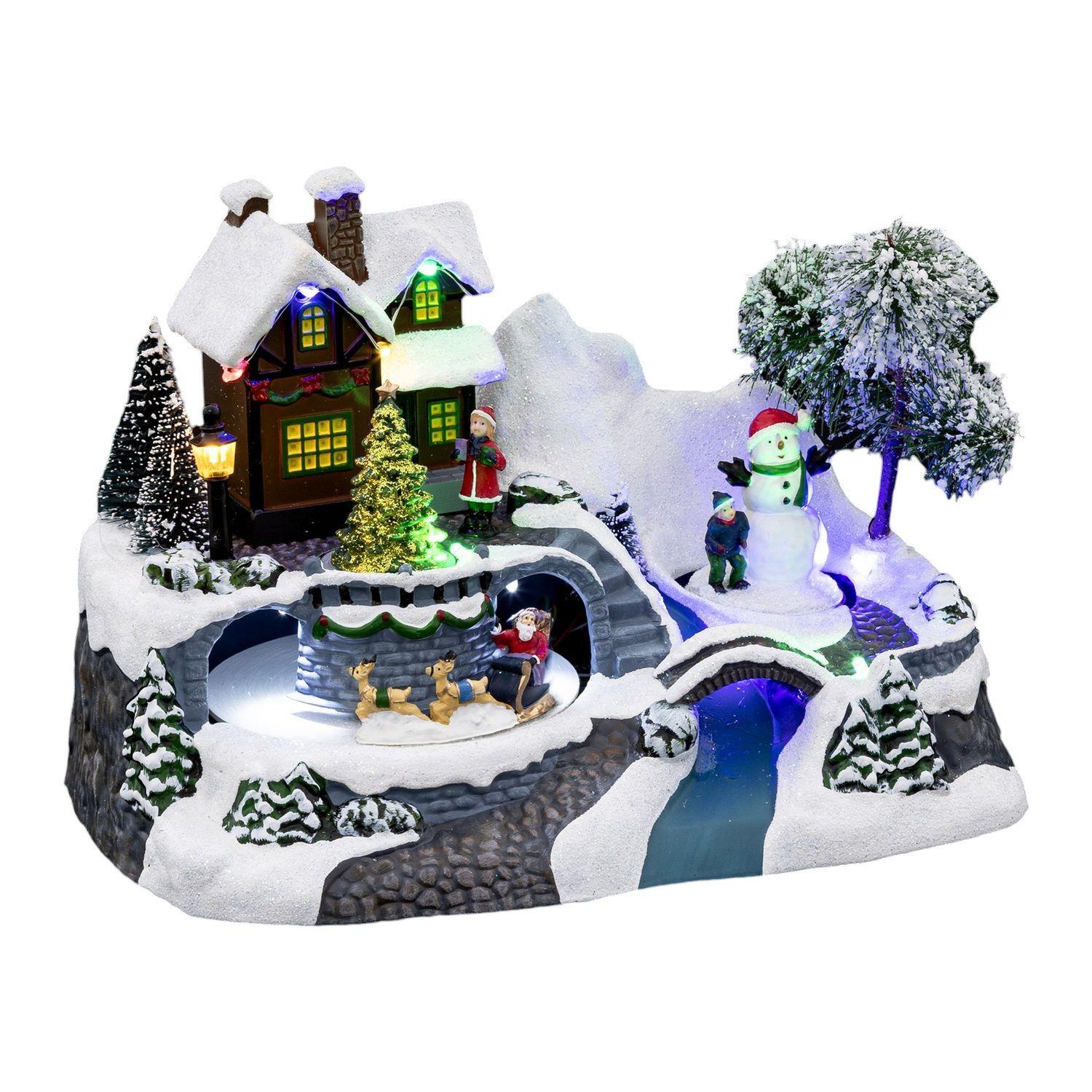 Village avec 1 maison, sapin et bonhomme de neige avec mouvement.FICHE TECHNIQUE- CARACTERISTIQUES TECHNIQUES- Dimensions : - Poids :