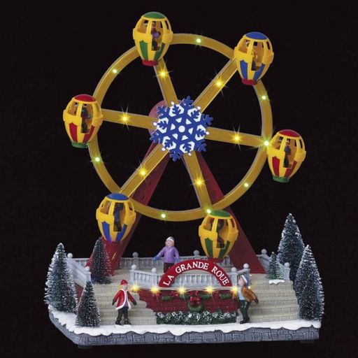 Informations Techniques : Dimensions : L. 28,5 x l. 21 x H. 38,5 cm Matière : PVC Spécificités : Pratique & Utile Village de Noël Grande Roue avec Ballon Forme Ronde Fonctions : Musicale, Mouvement & Lumineuse Alimentation : Transformateur type E Ampoules : 33 LEDs de coloris Multicolore Effet Lumi