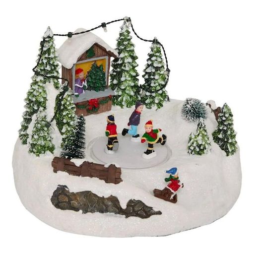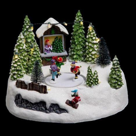 Informations Techniques : Dimensions : L. 21 x l. 15,3 x H. 22 cm Matière : Résine Spécificités : Pratique & Utile Village de Noël Patinoire avec Forêt Fonctions : Mouvement & Lumineuse Alimentation : Piles (3 x AA non incluses) Ampoules : 13 LEDs de coloris Multicolore Effet Lumière Fixe Poids : 0