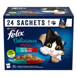 Bonjour, Nous vous remercions d'avoir partagé votre avis concernant nos FELIX Sachets repas délicieux duos sélection mixte en gelée pour chat 24 sachets 24x85g. Nous sommes désolés d'apprendre que votre chat refuse de manger ces sachets. Nous comprenons votre déception si le produit ne convient pas aux goûts de votre animal. Nous allons prendre en compte votre remarque concernant l'appétence du produit afin d'étudier la composition et les saveurs proposées. Bien cordialement.