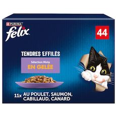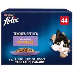 C'est si bon d'être un chat, surtout au moment des repas ! Faites plaisir à votre petit coquin avec la texture alléchante et les délicieuses saveurs de FELIX Aussi Bon que Beau. Il contient tout ce dont votre chat a besoin pour rester en bonne santé et actif. Chaque recette est spécialement préparée avec de tendres effilés enrobés d'une délicieuse gelée, avec des ingrédients de haute qualité qui raviront votre chat à tous les repas. Ils sont vraiment aussi bons qu'ils en ont l'air ! Et ce n'est pas tout ! FELIX est disponible dans une large gamme de recettes savoureuses. FELIX, tellement irrésistible !