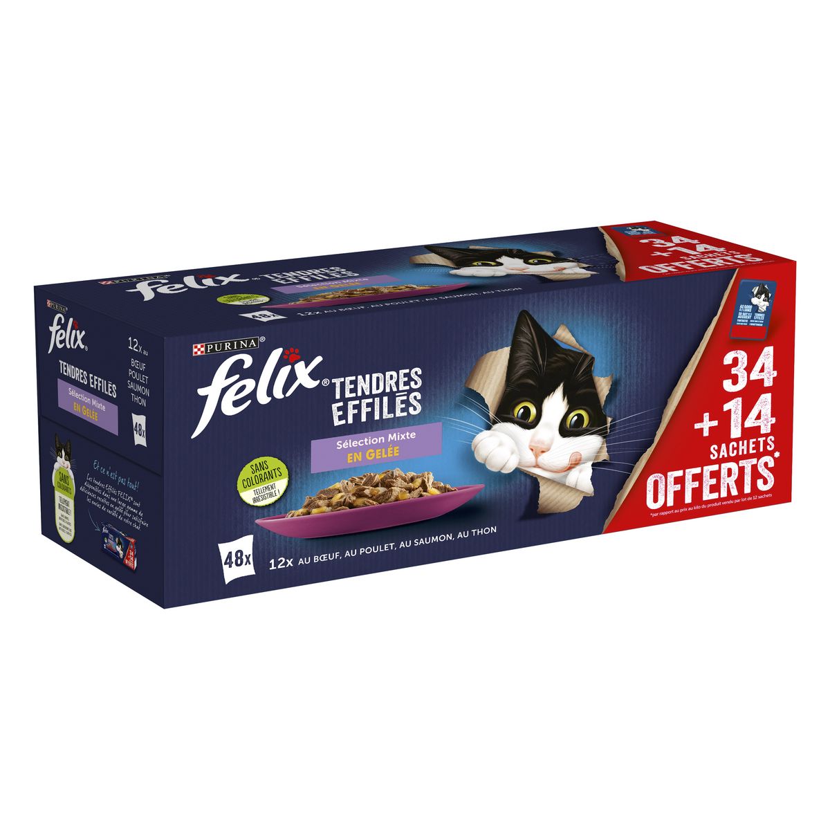 Les Tendres Effilés de FELIX® sont de savoureux repas à l’apparence, à l’odeur et au goût si appétissants que vous auriez pu les cuisiner vous-même. Chaque recette est composée d'ingrédients de qualité et contient de tendres effilés enrobés d’une gelée qui raviront votre chat à tous les repas ! Ces repas sont une source d’acides gras Oméga-6 avec le juste équilibre de vitamines pour aider votre chat à rester en pleine forme et à être prêt pour toujours plus de malice ! Ils contiennent tous les bienfaits nutritifs pour satisfaire 100% des besoins quotidiens de votre chat, selon les rations journalières recommandées sur l'emballage. Et ce n’est pas tout ! Les Tendres Effilés de FELIX® sont disponibles dans une large gamme de délicieuses recettes en gelée pour satisfaire les envies de variété de votre chat. Ils sont vraiment aussi bons qu'ils en ont l'air ! FELIX®, tellement irrésistible !