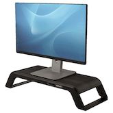 Le support d'écran Fellowes Hana (modèle 8060501) est conçu pour améliorer votre espace de travail et votre confort. Fabriqué en aluminium et bois avec une finition en asche-furnier noir, ce support robuste et élégant peut accueillir des moniteurs pesant jusqu'à 18 kg. Il dispose de 4 ports USB inté