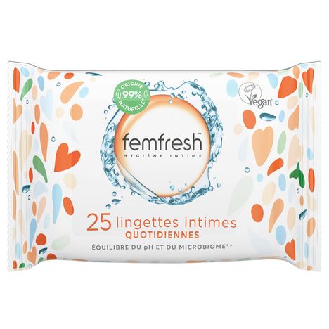 Les lingettes intimes quotidiennes Femfresh formulées aux extraits d’aloe vera et de calendula nettoient en douceur votre zone intime et vous procurent une fraîcheur longue durée.