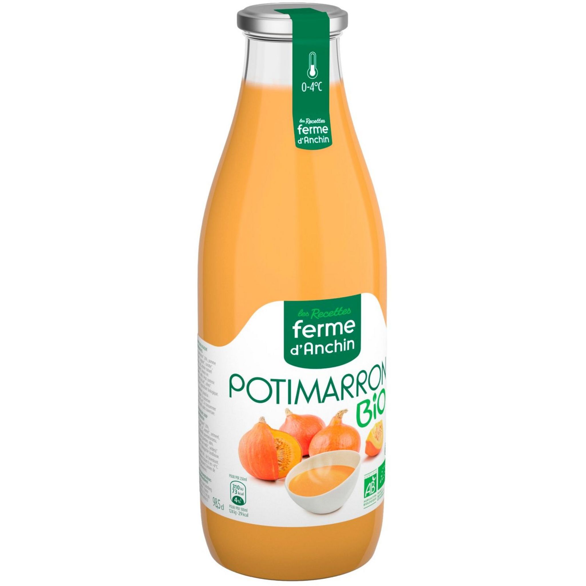 délicieux potage contenu dans une bouteille en verre fermée hermétiquement par une capsule type Twist off. Potage bio potimarron (98,5cl)