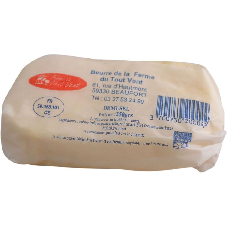 La Ferme du Tout Vent vous propose son beurre demi sel. Un produit artisanal au goût authentique à partir du bon lait de leurs vaches. La Ferme du Tout Vent, basée à Beaufort dans le Nord, est une exploitation familiale depuis 4 générations. Sur la ferme,les trois frères, Jean-Baptiste, Etienne et Matthieu Gorisse, élevent leurs vaches dans le plus grand soin, s'occupent de la traite ainsi que de la transformation des produits laitiers frais ( beurre, yaourt, fromage blanc, crème, ... ).