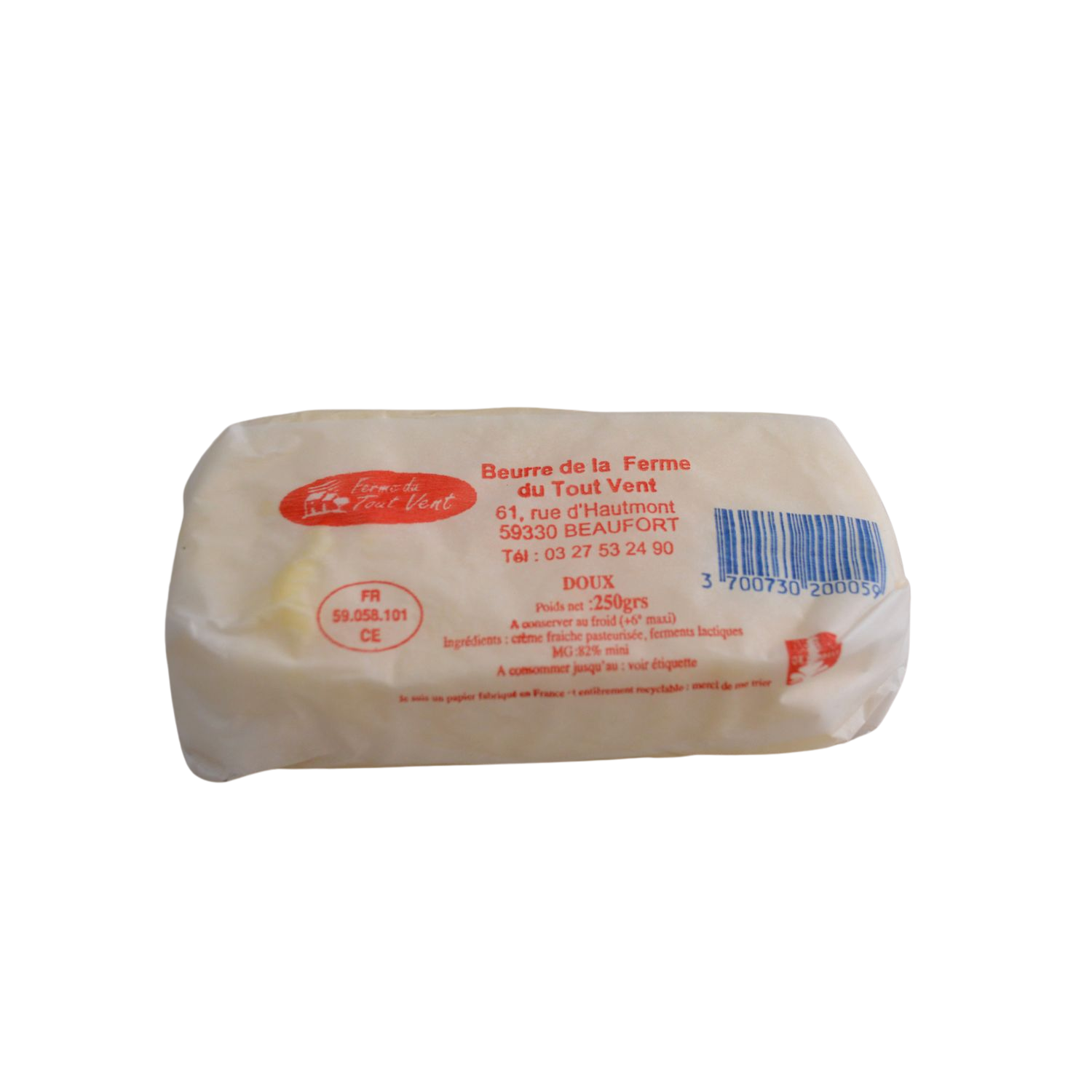 La Ferme du Tout Vent vous propose son beurre doux. Un produit artisanal au goût authentique à partir du bon lait de leurs vaches. La Ferme du Tout Vent, basée à Beaufort dans le Nord, est une exploitation familiale depuis 4 générations. Sur la ferme,les trois frères, Jean-Baptiste, Etienne et Matthieu Gorisse, élevent leurs vaches dans le plus grand soin, s'occupent de la traite ainsi que de la transformation des produits laitiers frais ( beurre, yaourt, fromage blanc, crème, ... ).