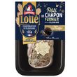 Ingrédients : Cuisse, suprême de chapon désossés en proportions variables origine France : 67% minimum, farce de volaille de Loué à la truffe de la Saint-Jean 1,1%* : 21% (viande de dinde de Loué origine France : 54%*, gras de porc, marrons cuits, eau, farine de BLÉ, conservateur : lactate de potassium, Cognac fine Champagne modifié (dont arôme naturel), sel, brisures de truffes de la Saint Jean : 1,1%* (brisures de truffes de la Saint Jean, jus de truffes de la Saint Jean, eau, sel), arômes, échalote, levure, antioxydant : ascorbate de sodium), barde de porc : 7%, poitrine de porc fumée tranchée : 2% (poitrine de porc origine france : 1.7%, sel, acidifiants : lactate de potassium et acétates de sodium, dextrose, antioxydant : érythorbate de sodium), galet aux cèpes (BEURRE, huile végétale (colza - tournesol), cèpes, sel, poivre blanc), décor (chapelure de riz et de maïs, épices, petits pois, graine de pavot bleu). * Pourcentages exprimés sur la farce