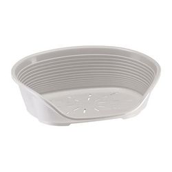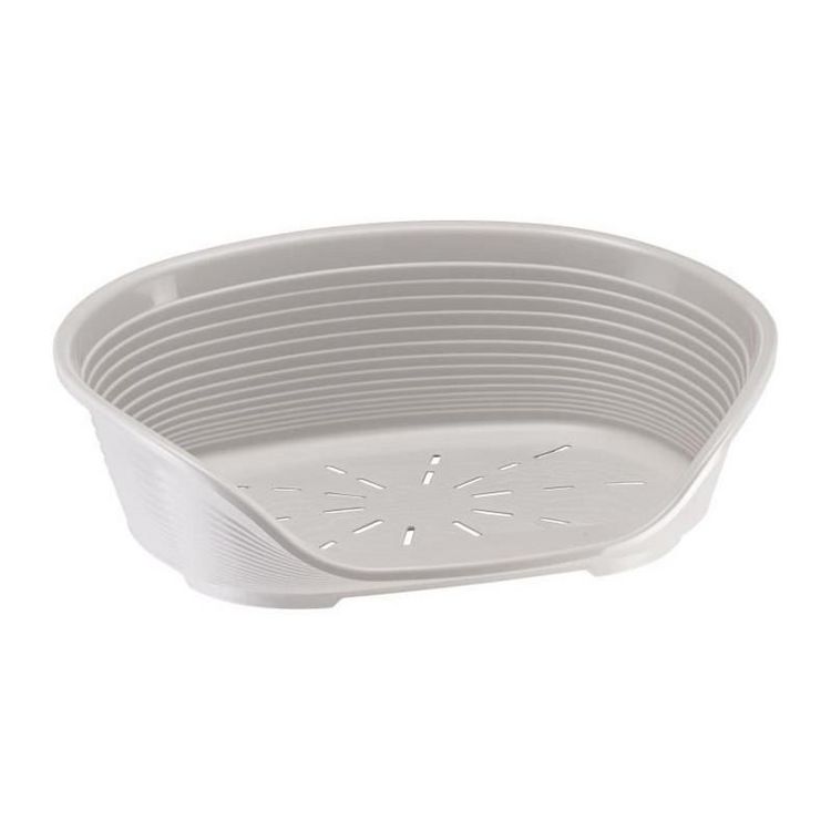 Corbeille en plastique pour chats et petits chiens au design élégant et moderne, coloris gris, avec perforation pour une bonne aération, anti-dérapant et appuie tete confortable. Dimensions : 61,5x45x21,5