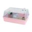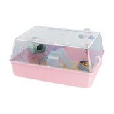 Cage en plastique pour hamsters permettant une bonne visibilité et une bonne ventilation grâce a la grille sur le côté supérieur, qui peut etre ouverte et fermée avec 2 clips en plastique. Nettoyage facile grâce a la base amovible. Accessoires inclus : plateau en plastique, maisonnette, roue, échell