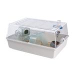 Cage en plastique pour hamsters permettant une bonne visibilité et une bonne ventilation grâce a la grille sur le côté supérieur, qui peut etre ouverte et fermée avec 2 clips en plastique. Nettoyage facile grâce a la base amovible. Accessoires inclus : plateau en plastique, maisonnette, roue, échelle, mangeoire et abreuvoir.