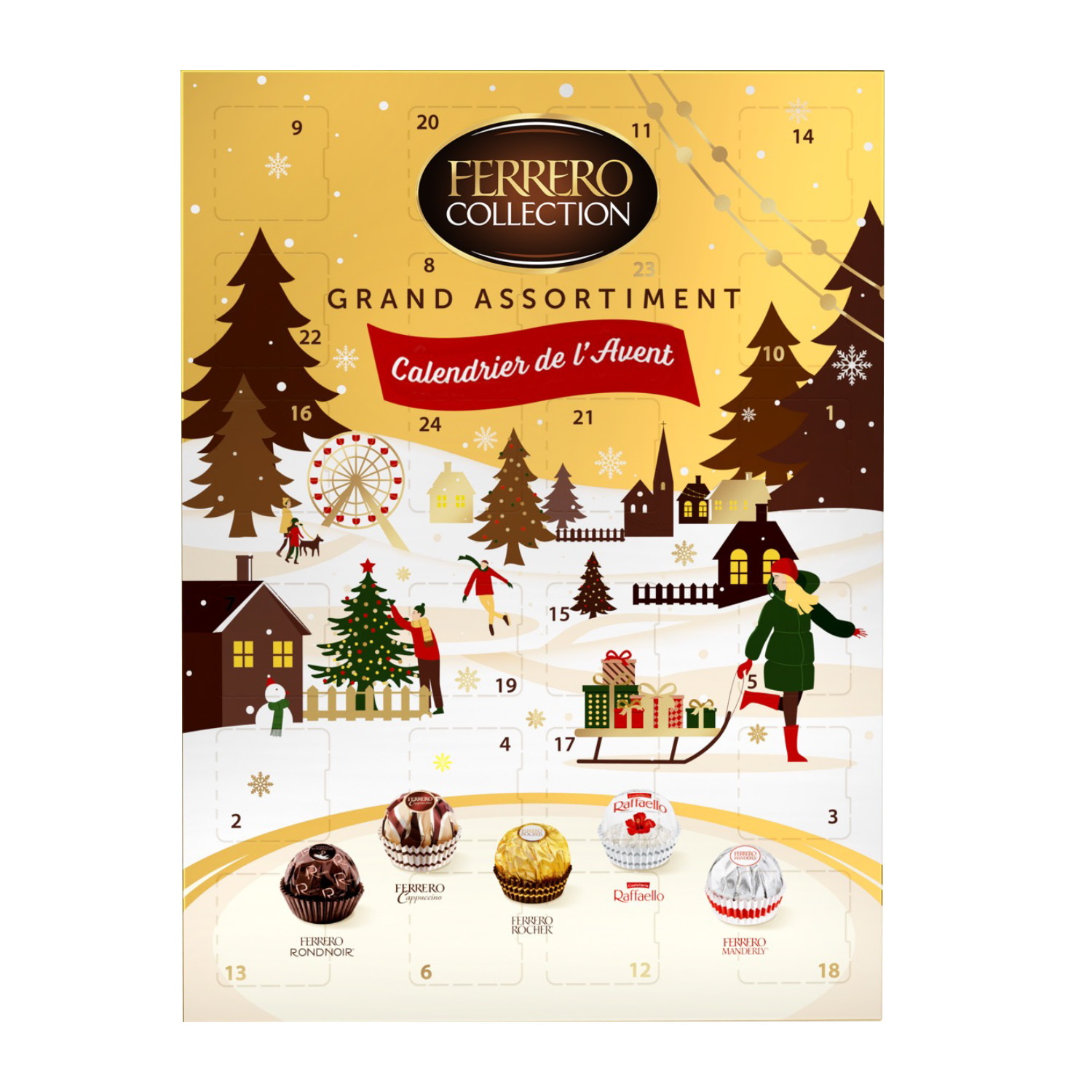 Collection calendrier de l'Avent chocolats au lait noisettes noix de coco amandes et cappuccino