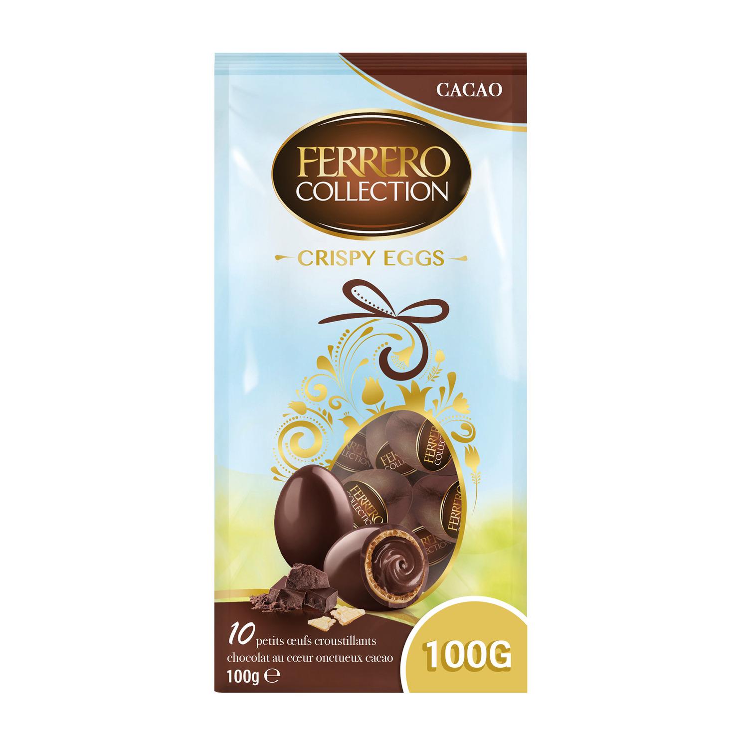 Découvrez nos œufs au chocolat Ferrero Collection, avec leur coquille au chocolat noir, leur gaufrette croustillante, et leur irrésistible fourrage onctueux au goût de cacao. Une découverte gourmande à partager.