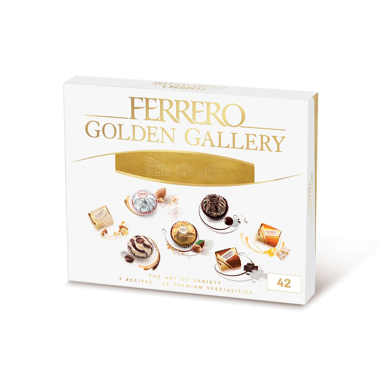 Assortiment bonbons chocolat et fines gaufrettes Une galerie de chefs d’œuvre raffinés, nés du savoir-faire unique de Ferrero. Un assortiment de 7 recettes exclusives pour une palette de saveurs uniques et irrésistibles, présentées dans un élégant coffret de 42 bouchées. Un cadeau qui allie originalité et raffinement avec 6 Ferrero Rocher, 6 Ferrero Manderly, 6 Ferrero Tenderly Blanc, 6 Ferrero Delicius, 6 Ferrero Tenderly Nougat, 6 Ferrero Cappucino et 6 Ferrero Tenderly Noir.