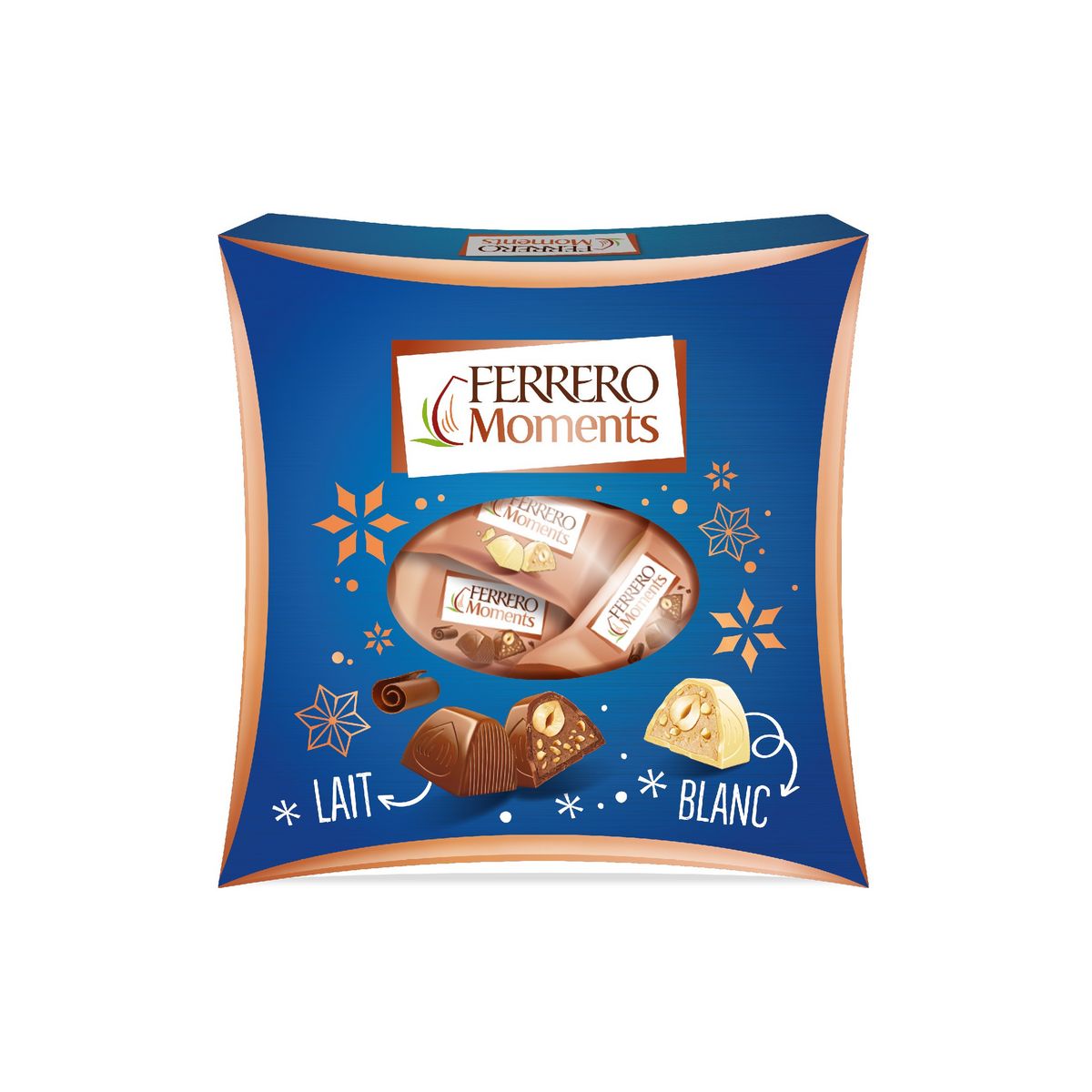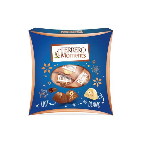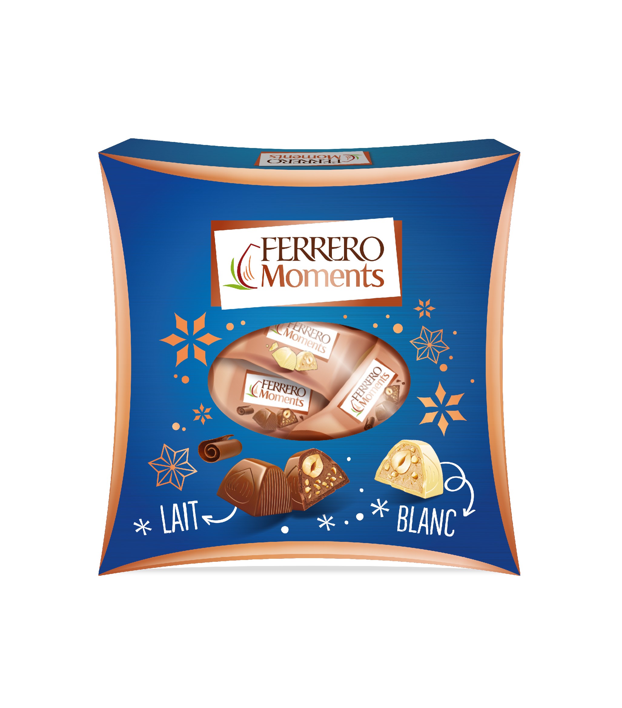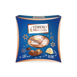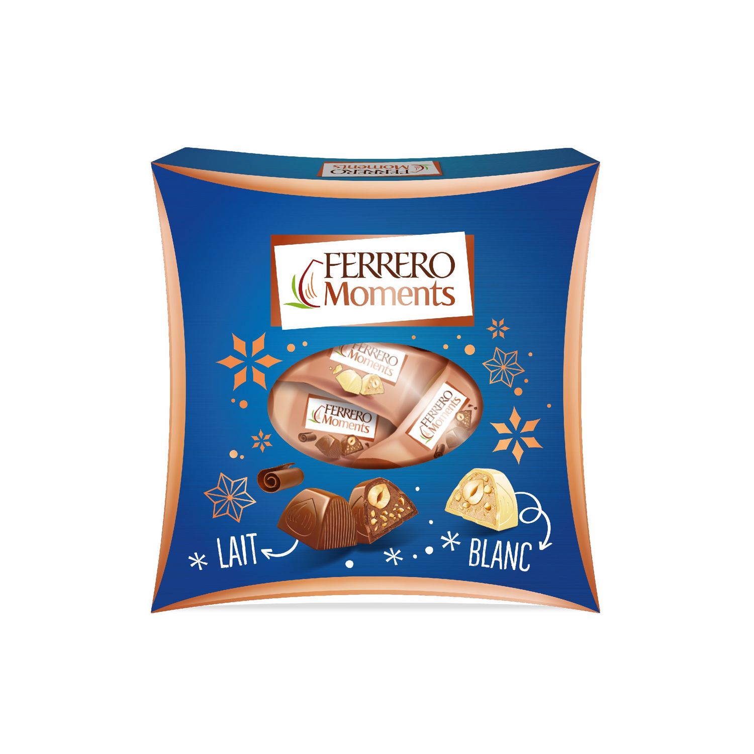 Confiserie chocolat Ferrero Moments, tout le plaisir de la noisette et du chocolat pour partager des moments gourmands ! Sous un fin chocolat, savourez un praliné fondant parsemé d’éclats de noisettes avec au cœur une noisette entière croquante. 2 saveurs pour ravir les gourmands : 11 Ferrero Moments au chocolat au lait & 10 Ferrero Moments de chocolat blanc.