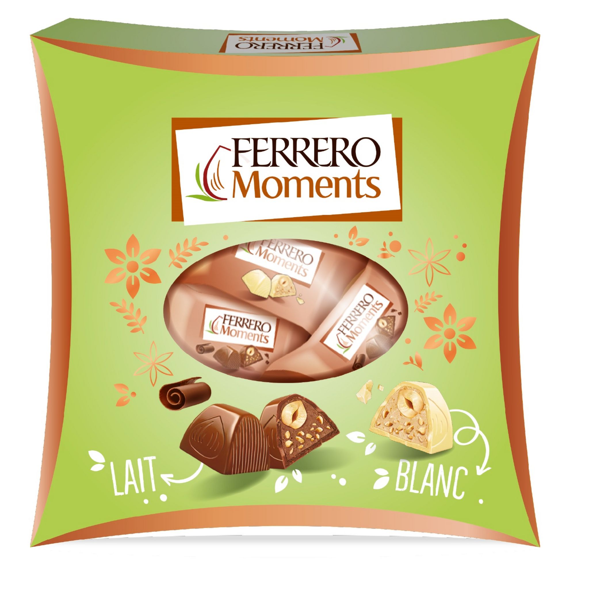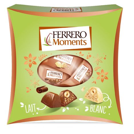 LAIT : chocolat au LAIT 31 % (sucre, pâte de cacao, beurre de cacao, LAIT en poudre, BEURRE concentré, émulsifiants : lécithines [SOJA] ; vanilline), NOISETTES 26,5%, chocolat fin 15% (sucre, pâte de cacao, beurre de cacao, émulsifiants : lécithines [SOJA] ; vanilline), huile de palme, sucre, LACTOSERUM en poudre, cacao maigre, vanilline.BLANC : chocolat blanc 46,5% (beurre de cacao, sucre, LAIT écrémé en poudre, BEURRE concentré, émulsifiants : lécithines [SOJA] ; vanilline), NOISETTES 26,5%, sucre, huile de palme, LACTOSERUM en poudre, vanilline