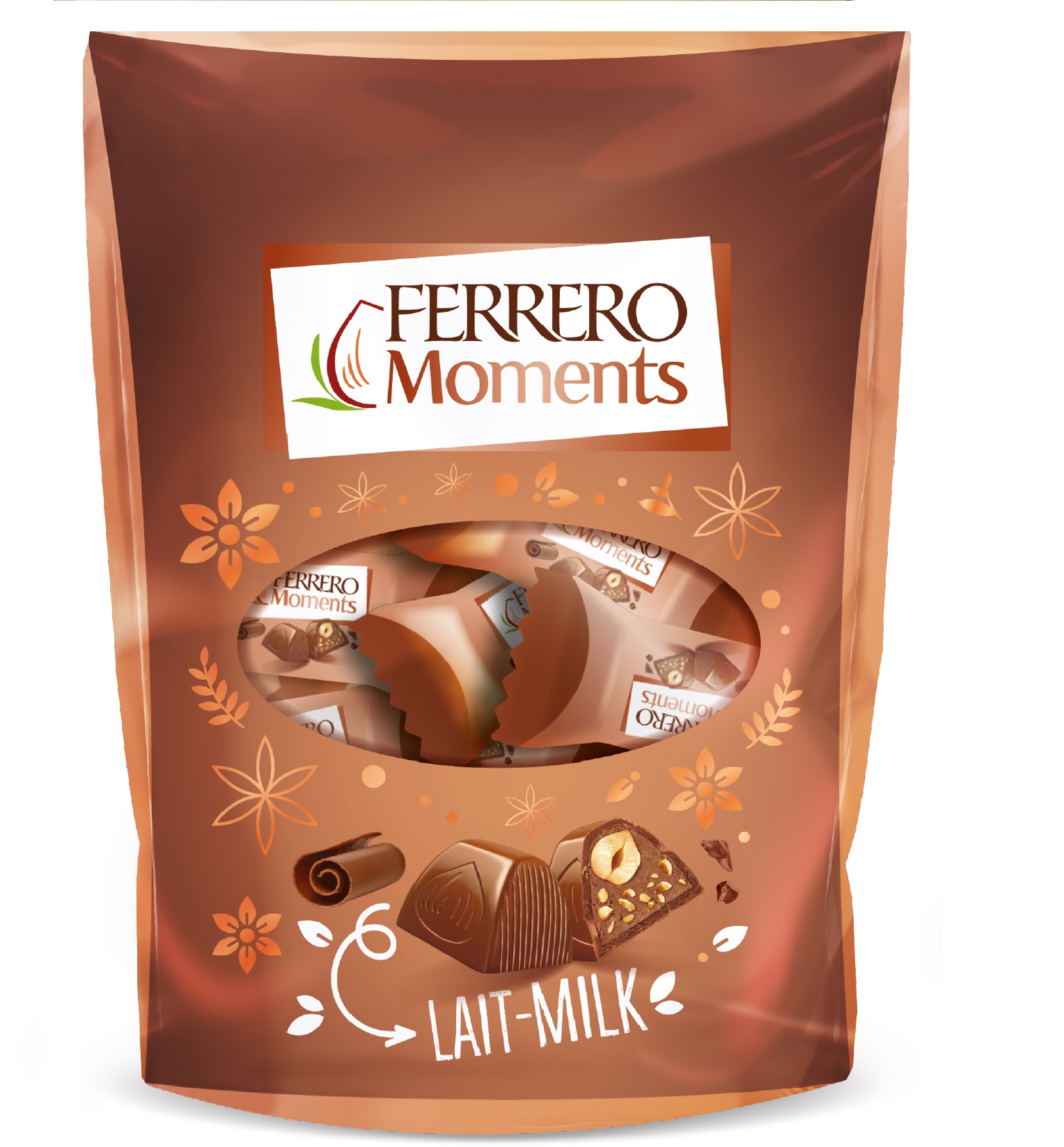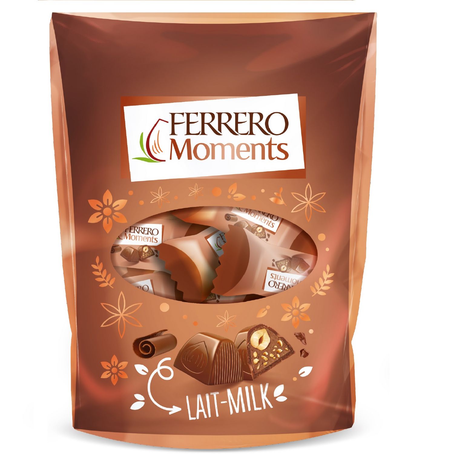 Confiserie chocolat Ferrero Moments, tout le plaisir de la noisette et du chocolat au lait pour partager des moments gourmands ! Sous un fin chocolat au lait, savourez un praliné fondant parsemé d’éclats de noisettes avec au cœur une noisette entière croquante. Sachet de 14 bouchées