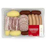 Déposer la saucisse fumée, les knacks, les saucisses fumées précuites, la poitrine fumée, les tranches de saucisson à l’ail dans un plat. Puis recouvrez les avec les pommes de terre et la choucroute (à sortir du sachet).