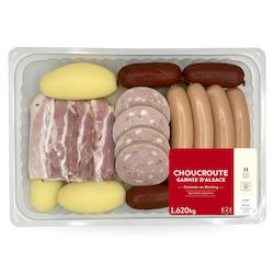 Ingrédients : Choucroute cuisinée 55% : Choucroute (origine France) 47%, jus de cuisson, saindoux, Riesling (contient SULFITES),