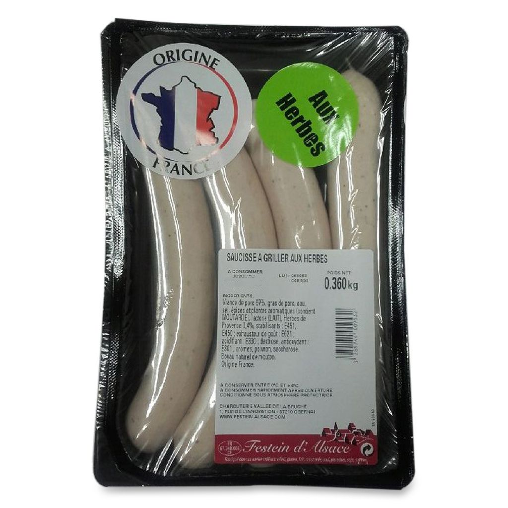 Saucisses blanches à griller aux herbes x4 Idéale pour le barbecue. Produit précuit, pouvant être également grillé à la plancha ou à la poêle