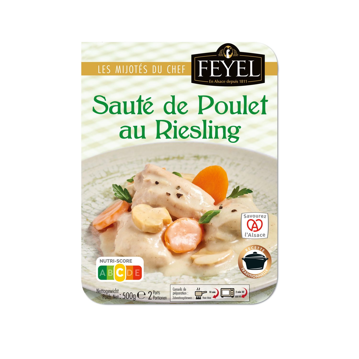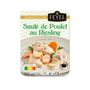 Viande de poulet 30% (origine France), eau, Riesling 16% (sulfites), champignons de Paris, carottes, crème 5% (LAIT), fécule de pomme de terre, bouillon de volaille 1,3% (sel, sirop de glucose de blé, arômes, graisse et viande de volaille (origine UE) (antioxydant : E392) (7,5%), oignon, plante aromatique, épices), oignons déshydratés, sel, épices.