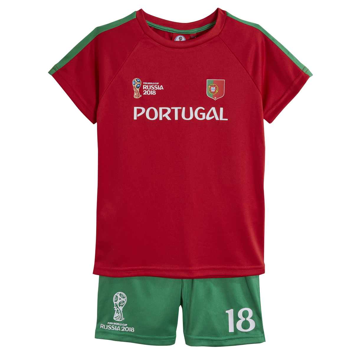En savoir +Les fans du ballon rond sont prêts à supporter leur équipe préférée avec cet ensemble tee-shirt et short spécial coupe du monde. Ensemble confortable et léger, matière respirante. Haut : tee-shirt à col rond et manches courtes, imprimé sur le devant, bandes colorées sur les épaules. Bas : short à la taille élastiquée, imprimé fantaisie. Cet ensemble de football, équipe Portugal, est facile d'entretien.