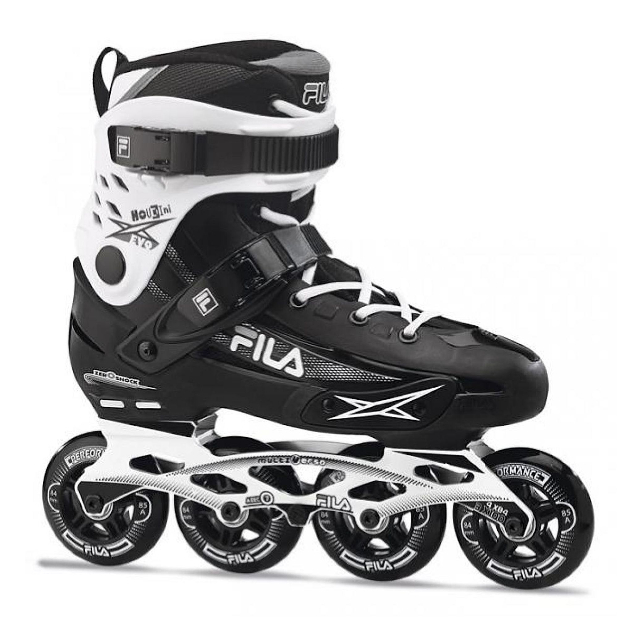 Platine en alu 6000 extrudée sérigraphiée - réglage latéral. Coque PU. Absorbeur de chocs. Cuff renforcé, coupe haute. Chaussure coupe sportive, rembourrage préformé, amortisseur de chocs. Fermeture laces et strap coup de pied avec boucle. Roues Fila 84mm / 85A. Roulements ABEC 7. Axes métal, entret
