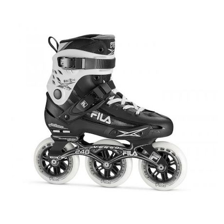 Platine en alu 6000 extrudée sérigraphiée - base 248mm - réglage latéral. Coque PU. Absorbeur de chocs. Cuff renforcé, coupe haute. Chaussure coupe sportive, rembourrage préformé, amortisseur de chocs. Fermeture laces et strap coup de pied avec boucle. Roues Fila 110mm / 84A. Roulements ABEC 9. infos + Axes 8 mm - entretoises aluminium. PAS de frein