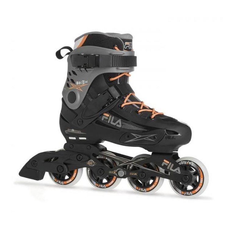 Platine en alu 6000 extrudée sérigraphiée - réglage latéral. Coque PU. Absorbeur de chocs. Cuff renforcé, coupe haute. Chaussure coupe sportive, rembourrage préformé, amortisseur de chocs. Fermeture laces et strap coup de pied avec boucle. Roues Fila 80mm / 83A. Roulements ABEC 7. Axes métal, entret