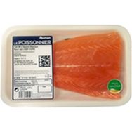 Barquette de filets de saumon. Garanti sans arêtes (contient moins d'une arête au kilogramme, d'une longueur égale ou supérieure à 10 mm ou d'un diamètre égal ou supérieur à 1mm ; une arête d'une longueur égale ou inférieure à 5mm n'est pas considérée comme un défaut si son diamètre ne dépasse pas 2mm).