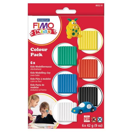 Assortiment de 6 pains FIMO Kids (jaune, vert foncé, rouge, bleu, blanc et noir). La FIMO Kids est une pâte polymère spécialement conçue pour les enfants.