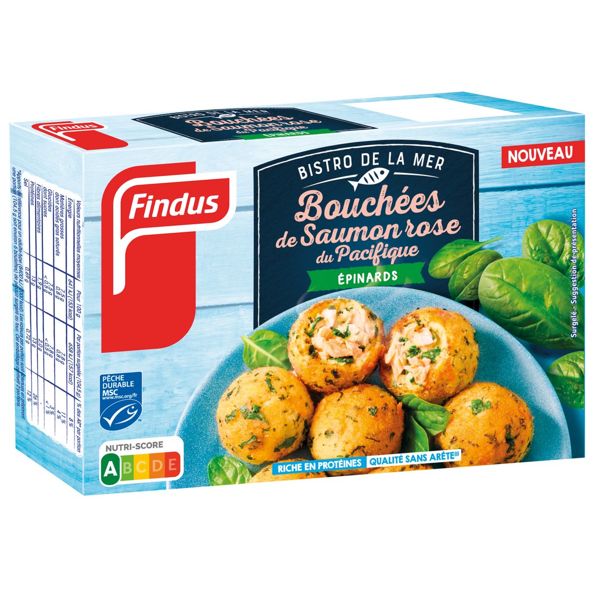 SAUMON ROSE DU PACIFIQUE 51%, épinards 28%, huile de colza, chapelure (farine de BLE, sel, dextrose, levure, huile de colza), farine de BLE, oignons, fibres de pois, amidon de maïs, sel, muscade, jus de citron à base de concentré.