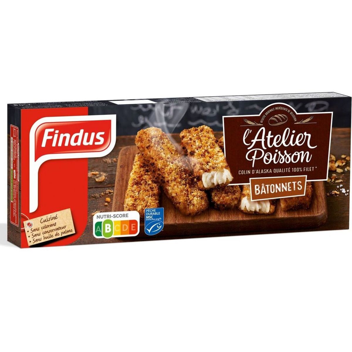 COLIN D'ALASKA 58%, chapelure 19% (farine de BLÉ, régulateur d'acidité : hydroxyde de sodium, sel, levure, sucre, dextrose, huile de colza, paprika), huile de colza, eau, farine de BLÉ, amidon de pommes de terre, sel.