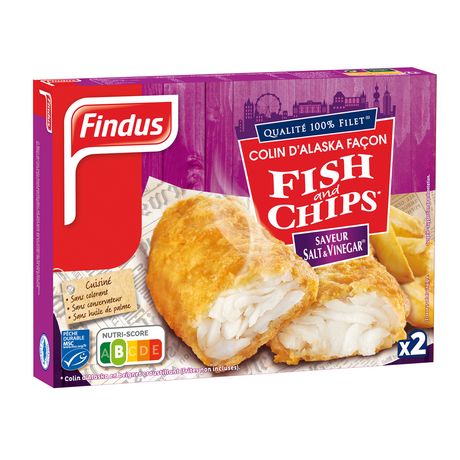Envie d'un déjeuner dans les rues de Londres ou d'une soirée dans un pub britannique ? C'est comme si vous y étiez avec nos savoureux Colins d'Alaska façon Fish & Chips saveur salt & vinegar. Un goût typiquement anglais pour une recette gourmande ! 2 portions composées de morceaux de filets de Colin d'Alaska (Theragra chalcogramma) pêché en océan Pacifique Nord-Ouest (61-02A) ou Nord-Est (67-01A), enrobées d'une pâte à beignet 30% aromatisée au vinaigre, préfrites, surgelées.