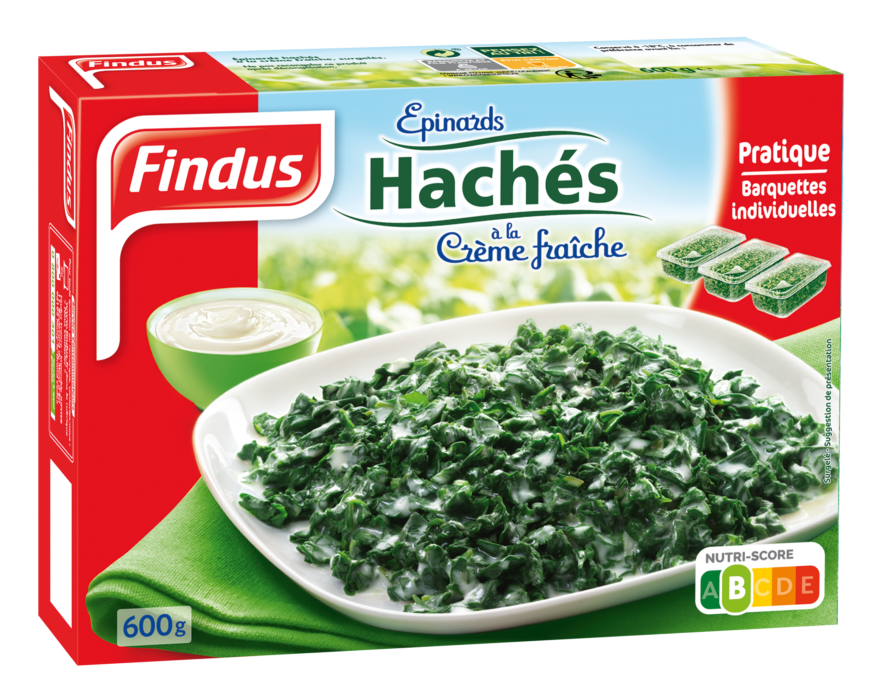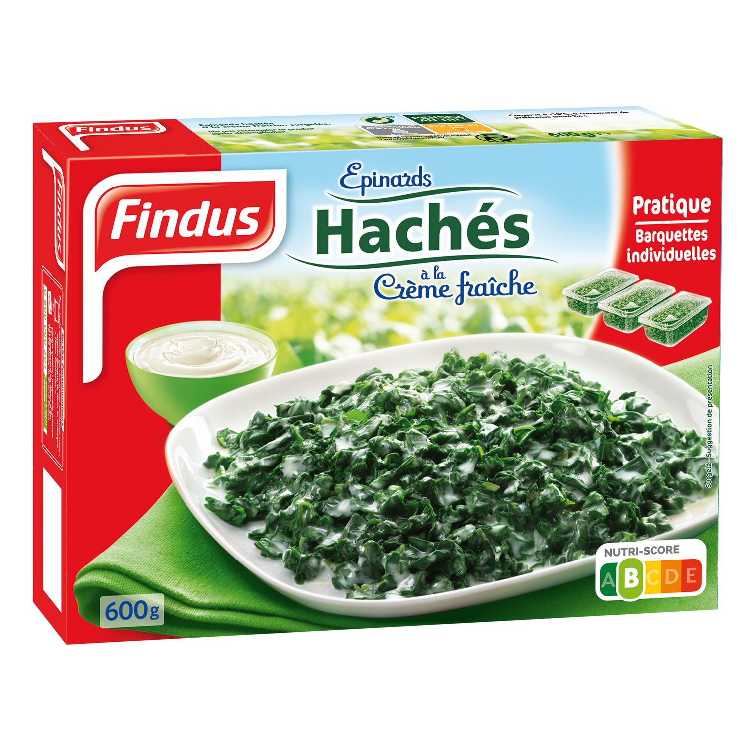 Epinards hachés à la crème fraîche, surgelés. Une recette toujours aussi savoureuse dans des barquettes plus pratiques ! Protection et cuisson optimale grâce à un opercule, facile à démouler, plus rapide à réchauffer au micro-ondes, en barquette individuelle déjà séparée. Les épinards Findus sont récoltés en pleine saison, mélangés à de la crème fraîche puis surgelés quelques heures seulement après la récolte afin de vous offrir un produit de grande qualité gustative.