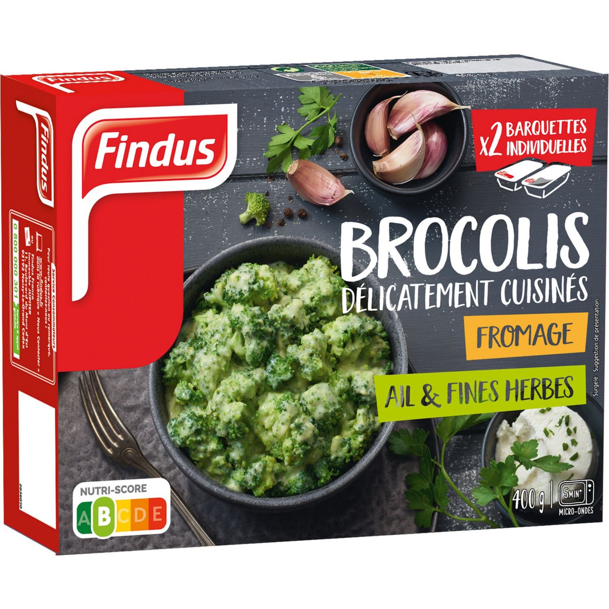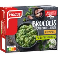 Brocolis au fromage, aux herbes aromatiques et à l'ail, surgelé. De fines fleurettes de brocolis cuisinées avec une sauce gourmande au fromage, agrémentée d’ail et de fines herbes pour relever le tout. Un vrai régal !