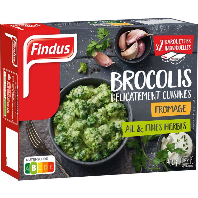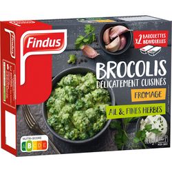 Brocolis au fromage, aux herbes aromatiques et à l'ail, surgelé.